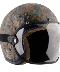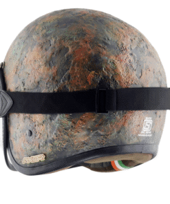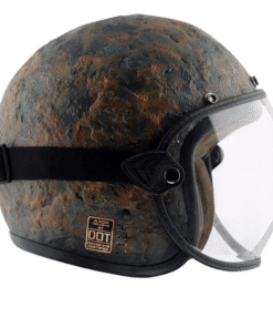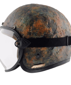 The Retro Jet Veer Helmet is a hand-sculpted design with a distinctive metal shield finish.