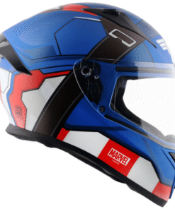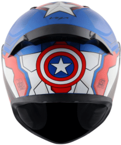 VEGA Bolt- A full-face helmet featuring Marvel Captain America graphic, perfectly designed for fans of the iconic superhero. The graphic is designed using vibrant red, white, and blue colors contrasting. On the back, his shield is a symbol of protection and justice. The helmet features a star, that Captain America has on the chest, creating a design of a legendary Avenger. This Bolt Captain America helmet gives you a dynamic and bold appearance, making it a must-have for any Marvel enthusiast.