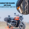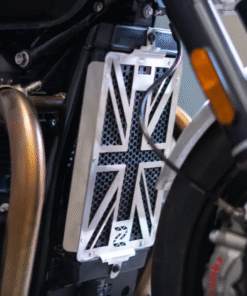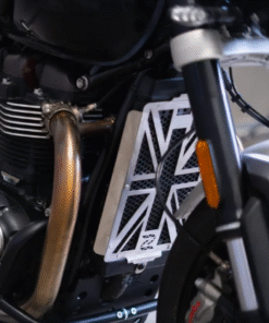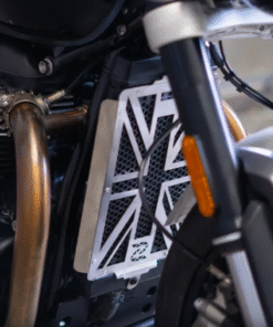 Radiator Guard for Triumph Speed Twin 900 – UK Flag (Silver) is crafted from premium aircraft-grade aluminum, designed to protect the radiator from long-term damage caused by debris and heat. Ideal for riders who frequently travel on gravel or dusty roads, this guard also shields the radiator from stone and pebble damage. The unit enhances the radiator’s heat dissipation, ensuring efficient cooling while safeguarding against minor damage.